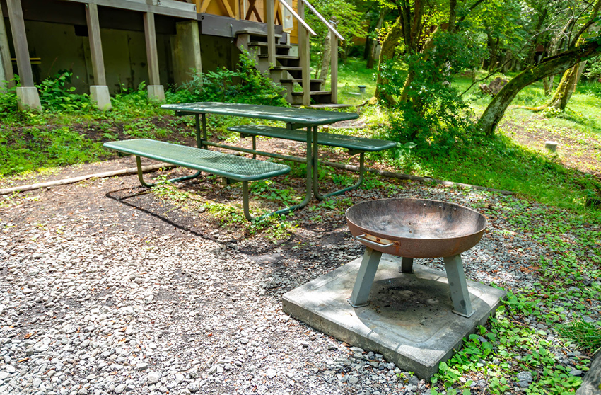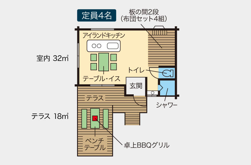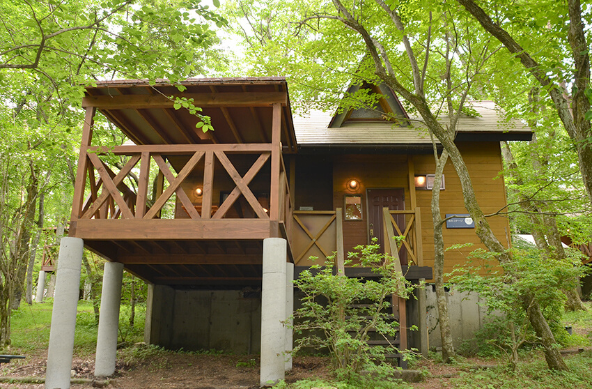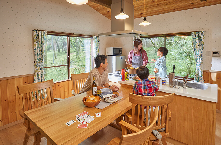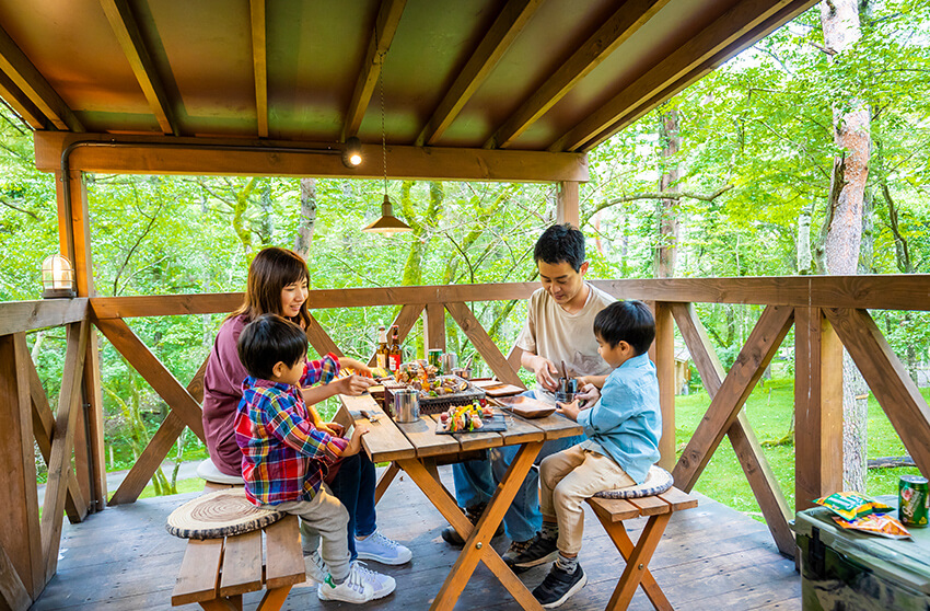 室内と隣接した屋根つきの大型テラスで森林浴を満喫しながらBBQを楽しめるコテージです。