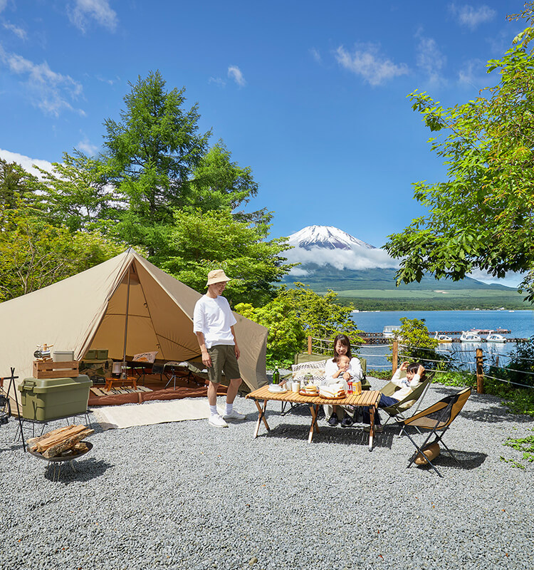 穏やかな湖畔と雄大な富士山を眺めながら