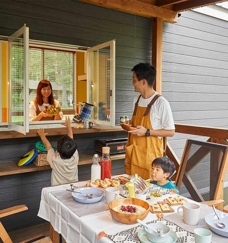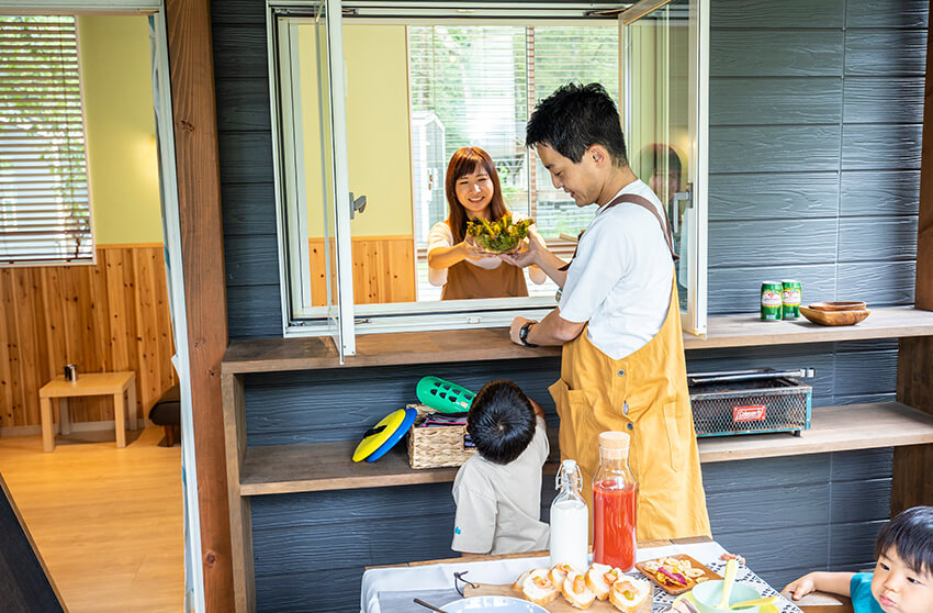 キッチンの両開き窓とテラスのバーカウンターをはさんで、
