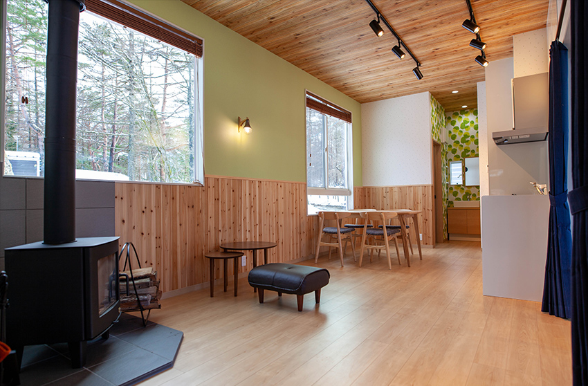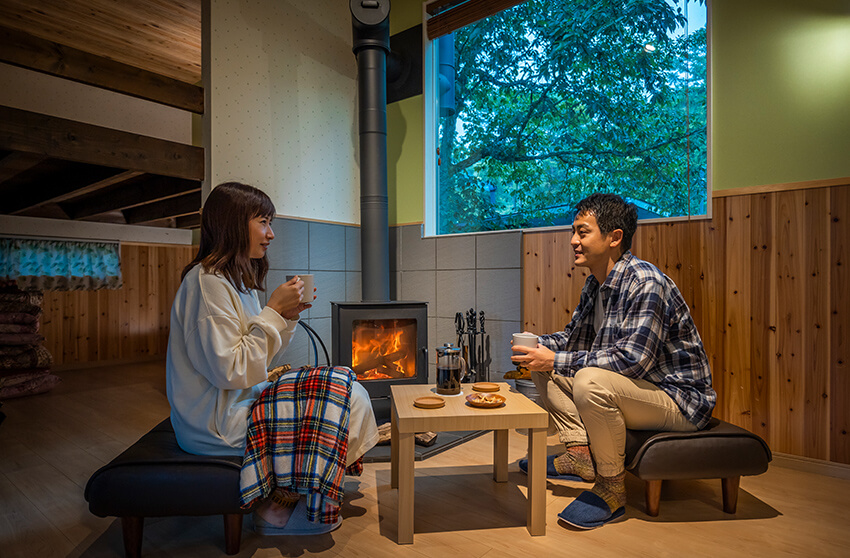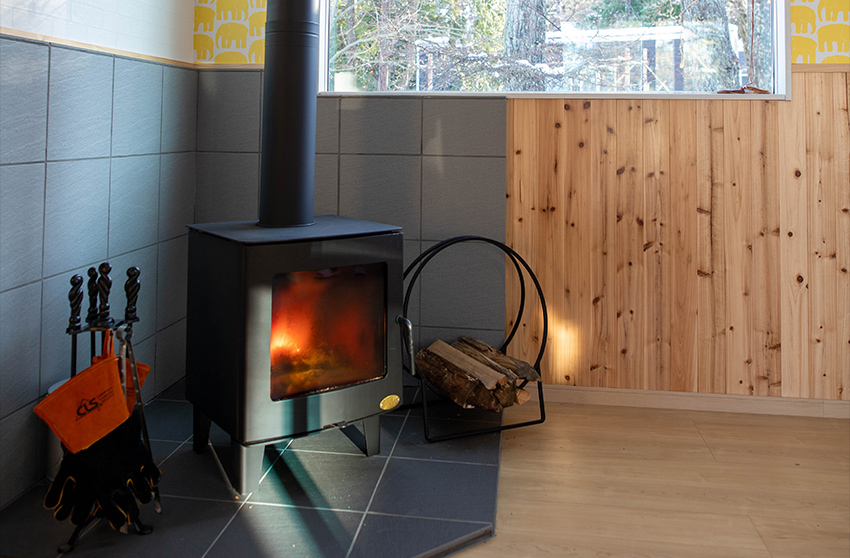 パチパチと音を立てる薪ストーブを囲みながら、薪をくべ、家族や仲間と時間の流れがゆるやかにほっこり団欒。