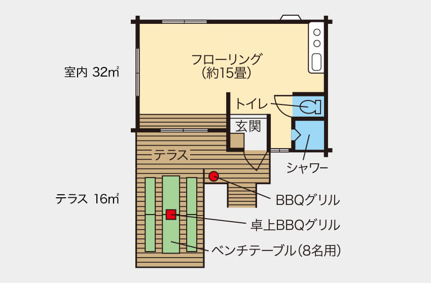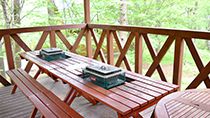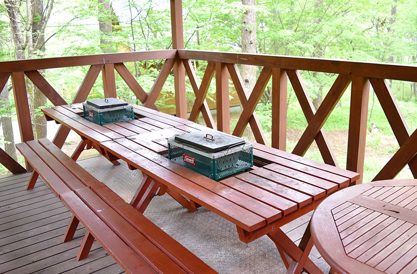 大きな屋根付きテラス内で大人数でバーベキューをすることもできます。