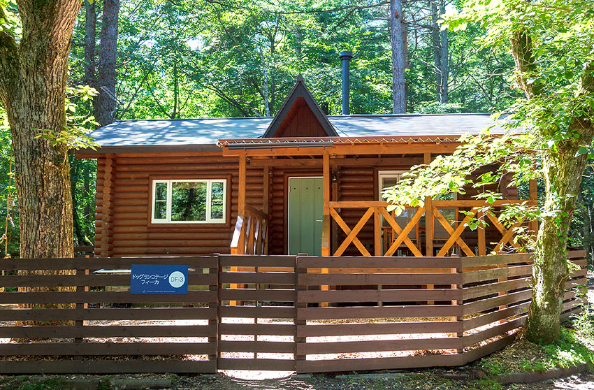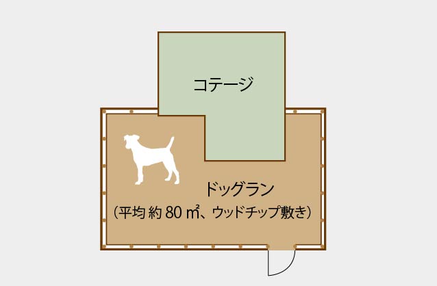 ウッドチップを敷きつめた広々としたプライベートドッグラン付きのコテージ。
