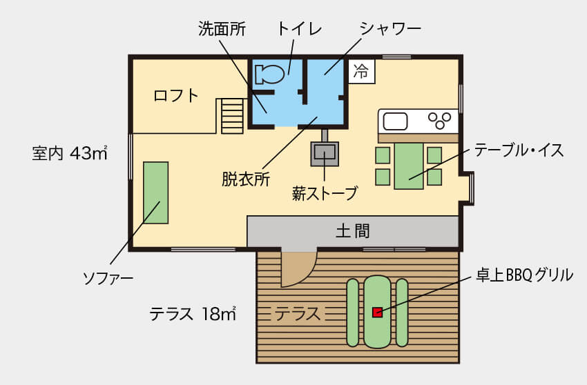キッチンから続く土間・開放的な窓・隣接した屋根付き大型テラスでは、広々一体化した空間でBBQが楽しめます。