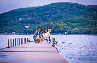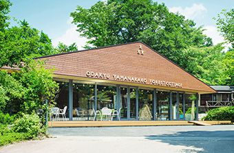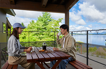 大きな窓や屋根付き大型テラス等、山中湖の自然を味わえるコテージ