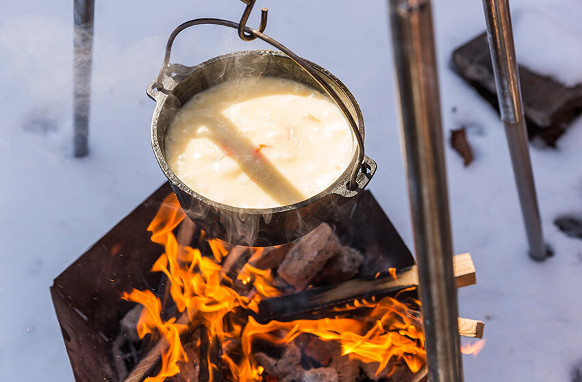 ここでオリーブオイルを追加(1.5cmほどの深さ位まで)する。 - ④温まるまでスキレットに蓋をし、弱火で5分ほどで出来上がり。